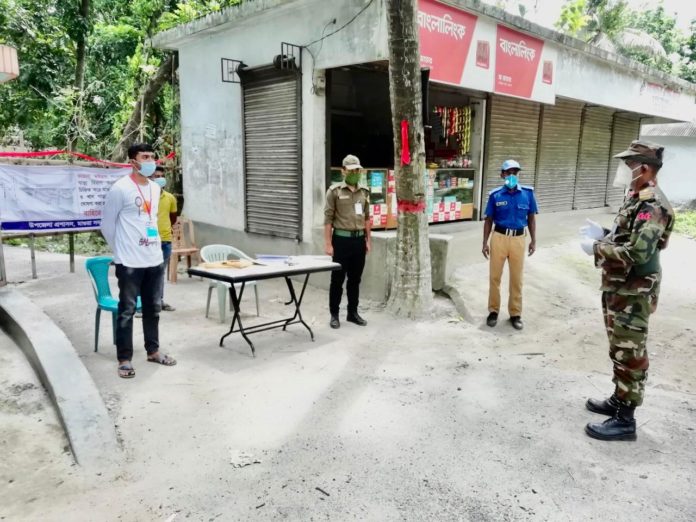 মহামারী করোনায় মাগুরা জেলার রেড জোন চিহ্নিত লকডাউনকৃত এলাকাসমূহের প্রবেশ পথে কর্তব্যরত ব্যক্তিদেরকে প্রয়োজনীয় উপদেশমূলক বক্তব্য প্রদানের প্রচেষ্টায় যশোর সেনানিবাসের এক সেনাসদস্য–লোকসমাজ