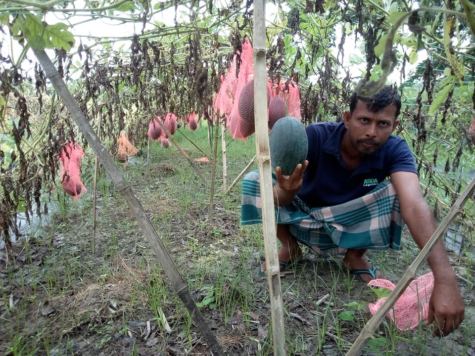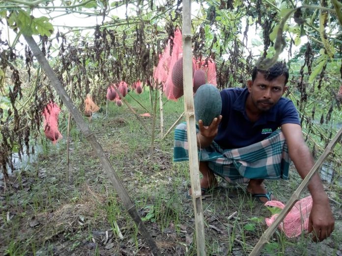 মফিজুল ইসলাম, শৈলকুপা (ঝিনাইদহ) ॥ চাষি হাবিবুর রহমান। ১০ বিঘা জমি লিজ নিয়ে গড়ে তুলেছেন কৃষি খামার। বিভিন্ন মৌসুমি ফল ও ফসলের চাষ করেন তিনি। তার এ খামারেই রোদ বৃষ্টি ঝড়ে ২০ শতক জমিতে অসময়ে তিনি চাষ করেছেন গ্রীষ্মকালীন তরমুজ। মাচার নিচেই ঝুলছে লাল নেটে বাঁধা কয়েক’শ এই সুস্বাদু ফল। আম্পান ঝড়ে প্রথম আসা ফুল ও কুঁড়ি নষ্ট হলেও তিনি এ তরমুজ চাষে লাভবান বলে জানান। অসময়ের এই তরমুজ তিনি চাষ করেছেন ঝিনাইদহের শৈলকুপার নবগ্রাম গ্রামে। চাষি হাবিবুর রহমান নবগ্রাম গ্রামের আতিয়ার রহমানের ছেলে।