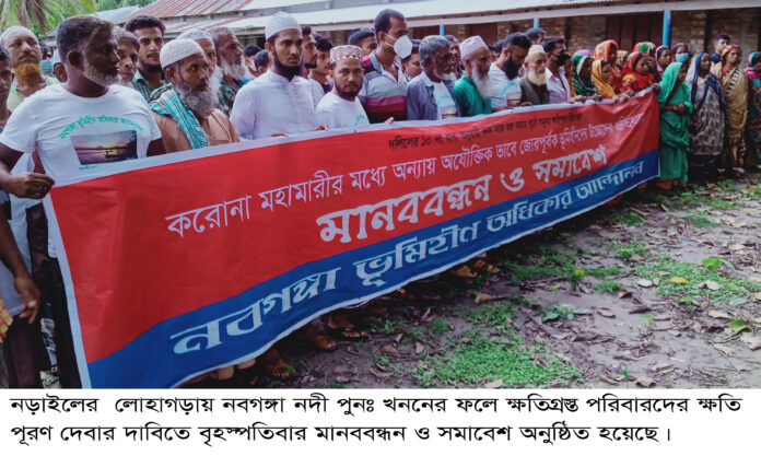 লোহাগড়া (নড়াইল) সংবাদদাতা ॥ নড়াইলের লোহাগড়ায় নবগঙ্গা নদী পুনঃখননের ফলে ক্ষতিগ্রস্তদের ক্ষতিপূরণ দেবার দাবিতে মানববন্ধন ও সমাবেশ অনুষ্ঠিত হয়েছে। বৃহস্পতিবার বেলা ১১ টার দিকে ও বুধবার বিকেলে কোটাকোল ইউনিয়নের চরকোটাকোল নূরানী হাফেজি ও কওমী মাদ্রাসা মাঠে এলাকাবাসীর আয়োজনে এ মানববন্ধন ও সমাবেশ অনুষ্ঠিত হয়। নবগঙ্গা ভূমিহীন অধিকার আন্দোলনের সভাপতি শেখ লায়েক আলীর সভাপতিত্বে অনুষ্ঠিত মানববন্ধন ও সমাবেশে বক্তব্য রাখেন সংগঠনের সাধারণ সম্পাদক মো. টুলু শেখ, সদস্য আলী রেজা তুহিন, শামীম শাহজাহান জুয়েল, আবুল কালাম বিশ^াস কালু, রাসেল শেখ, ফারুক মুন্সী, নজরুল ইসলাম, লালন শেখ প্রমুখ।