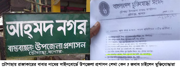 চৌগাছা (যশোর) সংবাদদাতা॥ যশোরের চৌগাছায় সদর ইউনিয়নের কড়ইতলা বাজারে রাজাকারের পিতা ও স্বাধীনতা বিরোধী হিসেবে পরিচিত আহমদ আলীর (আহম্মদ নগর) নাম লেখা একটি সাইন বোর্ডে “বাস্তবায়নে উপজেলা প্রশাসন” লেখা কেন জানতে চইলেন বীর মুক্তিযোদ্ধারা। বুধবার বিভিন্ন সংবাদপত্রে রাজাকারের পিতা ও পিস কমিটির সদস্যের নামে বাজারের নামকরনের ষড়যন্ত্রের বিরুদ্ধে মানববন্ধন করেন এলাকাবাসী। যা বিভিন্ন সংবাদ পত্রে প্রকাশিত হয়। বুধবার সকালে বীর মুক্তিযোদ্ধারা সরেজমিনে বাজারটি পরিদর্শন করেন। সেখানে তারা সাইনবোর্ডের লেখা দেখে ক্ষুদ্ধ হন।