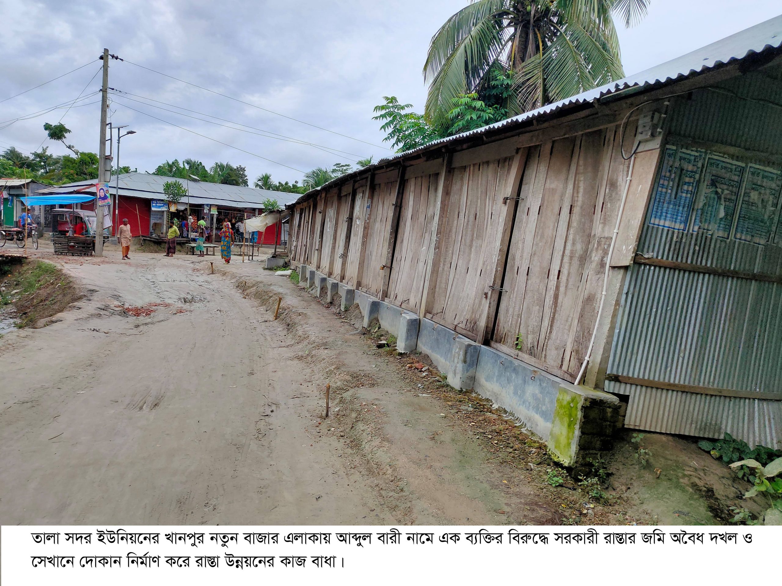 সাতক্ষীরার তালা উপজেলার সদর ইউনিয়নের খানপুর নতুন বাজার এলাকায় আব্দুল বারী নামে এক ব্যক্তির বিরুদ্ধে সরকারী রাস্তা দখল করে দোকান নির্মাণ করে রাস্তা উন্নয়নের কাজে বাধা সৃষ্টি করছেন-লোকসমাজ