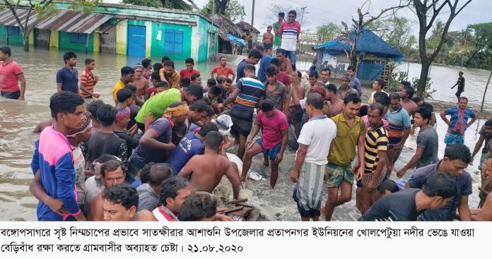 সাতক্ষীরার উপকূলীয় উপজেলার গ্রামগুলোর অসহায় মানুষ জোয়ারের তোড়ে ভেঙে যাওয়া বেড়িবাঁধ সংস্কারের চেষ্টা করছেন -লোকসমাজ