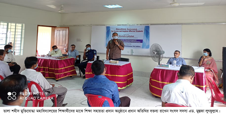 তালা (সাতক্ষীরা) সংবাদদাতা ॥রবিবার (২৩ আগষ্ট) সকালে তালা শহীদ মুক্তিযোদ্ধা মহাবিদ্যালয়ে করোনা ও আম্ফানে ক্ষতিগ্রস্ত ১৩০ শিক্ষার্থীদের মাঝে শিক্ষা সহায়তা হিসেবে নগদ অর্থ প্রদান করা হয়। এ সময় ৩ জন মেধাবী ও অস্বচ্ছল শিক্ষার্থীকে একটি করে সম্পার্ট ফোন প্রদান করা হয়। শহীদ মুক্তিযোদ্ধা মহাবিদ্যালয়ের আয়োজনে এবং জাপানী ব্যবসায়ী ইয়োসিকি তাকাশিমা ও অত্র কলেজের প্রাক্তন শিক্ষার্থীদের অর্থায়নে এক অনুষ্ঠানে প্রধান অতিথি হিসেবে উপস্থিত ছিলেন সাতক্ষীরা-১ (তালা-কলারোয়া) আসনের সংসদ সদস্য এড. মুস্তফা লুৎফুল্লাহ। অনুষ্ঠানে সভাপতিত্ব করেন শহীদ মুক্তিযোদ্ধা মহাবিদ্যালয়ে অধ্যক্ষ এম এম এনামুল ইসলাম। অত্র কলেজের প্রাক্তন শিক্ষার্থী মায়া বসুর পরিচালনায় অনুষ্ঠানে বিশেষ অতিথি হিসেবে উপস্থিত ছিলেন তালা উপজেলা বন কর্মকর্তা মোঃ মিজানুর রহমান, অত্র মহাবিদ্যালয়ে উপাধ্যক্ষ মহিবুল্লাহ মোড়ল এবং তালা থানার এস আই দেব কুমার দাশ। এ সময় সংসদ সদস্য এড. মুস্তফা লুৎফুল্লাহ’র পক্ষ থেকে শহীদ মুক্তিযোদ্ধা মহাবিদ্যালয়ের তিনশত শিক্ষার্থীর মাঝে ফলজ, বনজ ও ভেষজ চারা বিতরণ করা হয়।