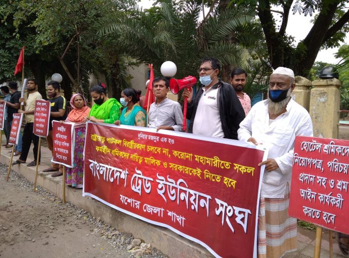 বিভিন্ন দাবি আদায়ের লক্ষ্যে বাংলাদেশ ট্রেড ইউনিয়ন সংঘ যশোর জেলা শাখা বুধবার প্রেসক্লাব যশোরের সামনে মানববন্ধন কর্মসূচি পালন করে-লোকসমাজ