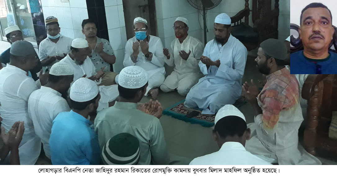 লোহাগড়া(নড়াইল)সংবাদদাতা ॥ নড়াইলের লোহাগড়া পৌর বিএনপির সাধারন সম্পাদক জাহিদুর রহমান রিকাতের রোগমুক্তি কামনায় মিলাদ মাহফিল অনুষ্ঠিত হয়েছে। রিকাত হৃদ রোগে আক্রান্ত হয়ে ঢাকার একটি হাসপাতালে চিকিৎসাধীন।