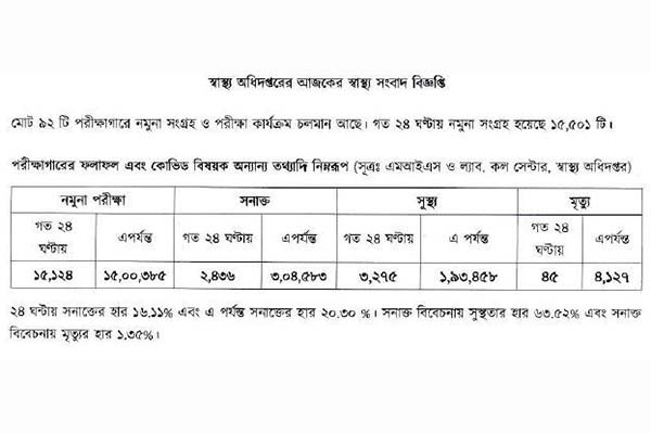 লোকসমাজ ডেস্ক॥ বাংলাদেশে গত ২৪ ঘণ্টায় নতুন করে ২৪৩৬ জনের মধ্যে করোনাভাইরাস শনাক্ত হয়েছে। আর এই সময়ের মধ্যে কোভিড-১৯ আক্রান্ত হয়ে মারা গেছেন ৪৫ জন।