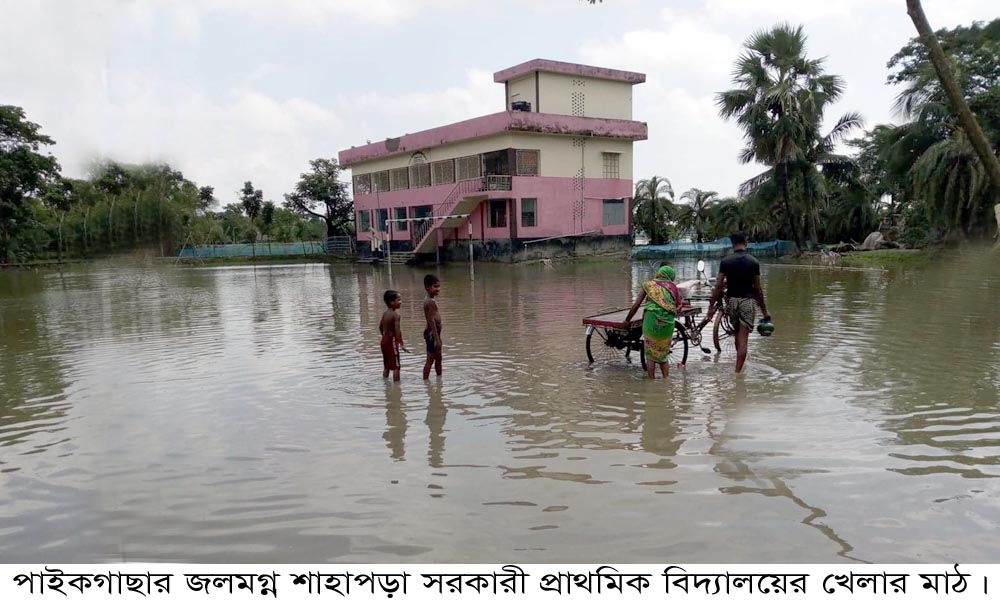 পাইকগাছার কপোতাক্ষী মাধ্যমিক ও শাহাপড়া সরকারী প্রাথমিক বিদ্যালয়ের খেলার মাঠ পানিতে নিমর্জিত দু’বিদ্যালয়ের ৫ শতাধিক শিক্ষার্থী খেলাধুলা থেকে বঞ্চিত