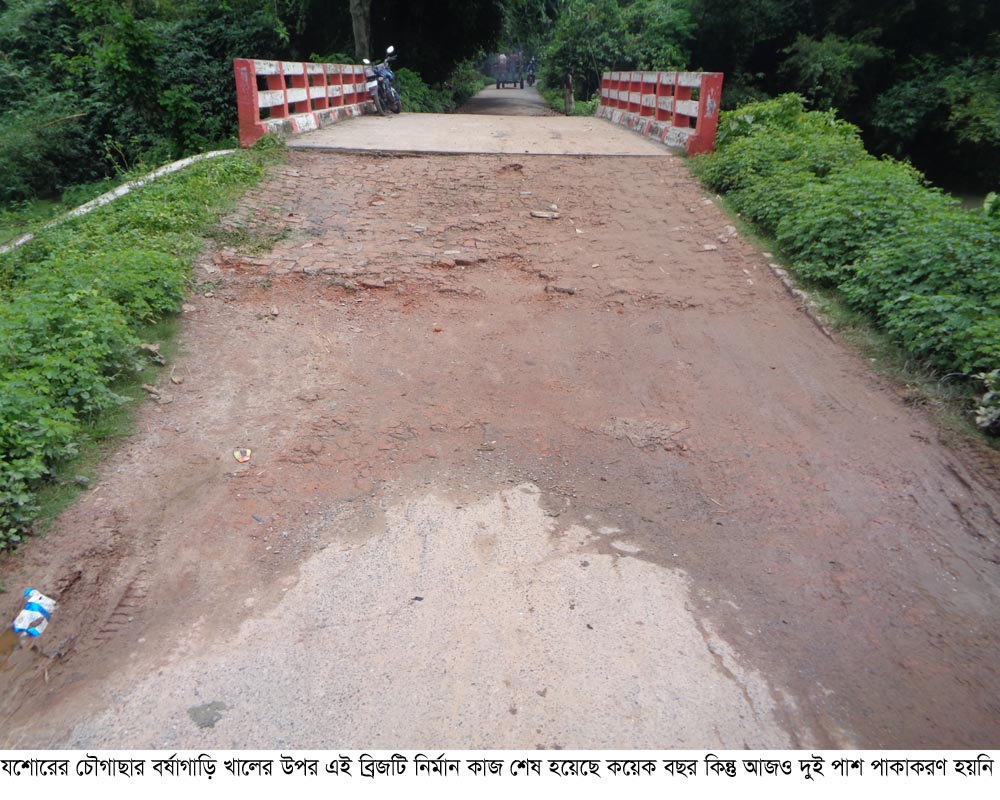 যশোরের চৌগাছার বর্ষগাড়ি খালের উপর এই ব্রিজটি নির্মাণ কাজ শেষ হয়েছে কয়েক বছর আগে, কিন্তু আজও দুই পাশে সংযোগ সড়ক পাকাকরণ হয়নি-লোকসমাজ