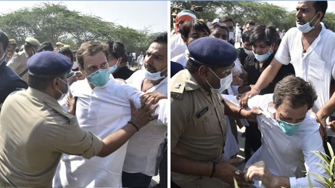 কংগ্রেসের এই নেতা এক টুইট বার্তায় পুলিশের লাঠিচার্জের শিকার হয়েছেন বলে জানিয়েছেন। একই সঙ্গে পুলিশ সদস্যরা তাকে ধাক্কা মেরে মাটিতে ফেলে দিয়েছেন বলেও অভিযোগ করেন তিনি। সামাজিক যোগাযোগমাধ্যমে ছড়িয়ে পড়া এক ভিডিওতে দেখা যায়, কংগ্রেস নেতা রাহুল গান্ধী পুলিশের সঙ্গে বাগবিতণ্ডায় জড়িয়েছেন। ভিডিওতে পুলিশ সদস্যদের উদ্দেশ্যে রাহুল গান্ধীকে বলতে শোনা যায়, আমাকে কেন আটক করছেন? আমাকে আটকের কারণ কি? গণমাধ্যমের কাছে পরিষ্কার করুন। তখন পুলিশের এক সদস্যকে বলতে শোনা যায়, সরকারি বিধির ১৮৮ ধারা লঙ্ঘনের দায়ে আটক করা হচ্ছে। ভিডিওতে দেখা যায়, পথরোধকারী পুলিশ সদস্যদের প্রতিরোধের চেষ্টা করছেন রাহুল গান্ধী। পরে ধাক্কাধাক্কির একপর্যায়ে মাটিতে পড়ে যান কংগ্রেসের অন্যতম এই নেতা।