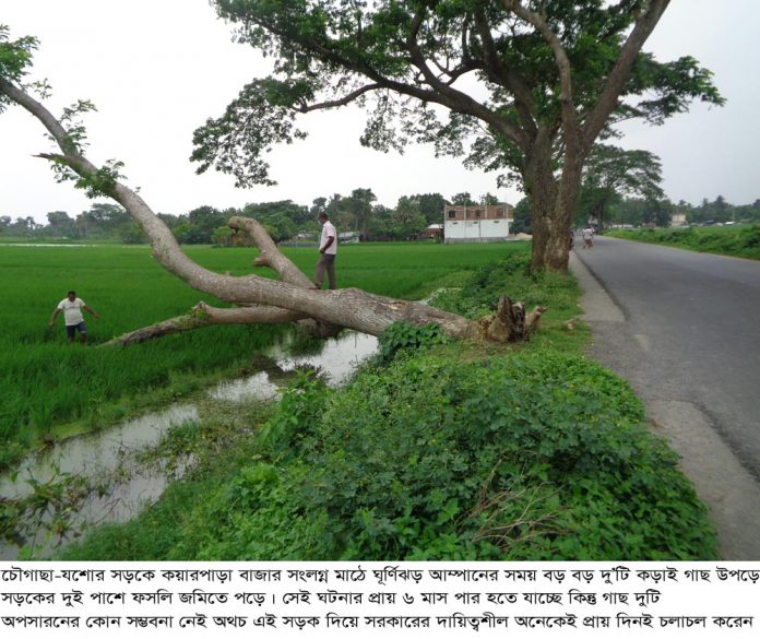 চৌগাছা-যশোর সড়কে কয়ারপাড়া বাজার সংলগ্ন মাঠে ঘুর্ণিঝড় আম্পানের সময় বড় বড় দুটি কড়ই গাছ উপড়ে সড়কের দুই পাশে ফসলি জমিতে পড়ে। প্রায় ৬ মাস পার হতে যাচ্ছে কিন্তু গাছ দুটি সরিয়ে নেয়া হয়নি-লোকসমাজ