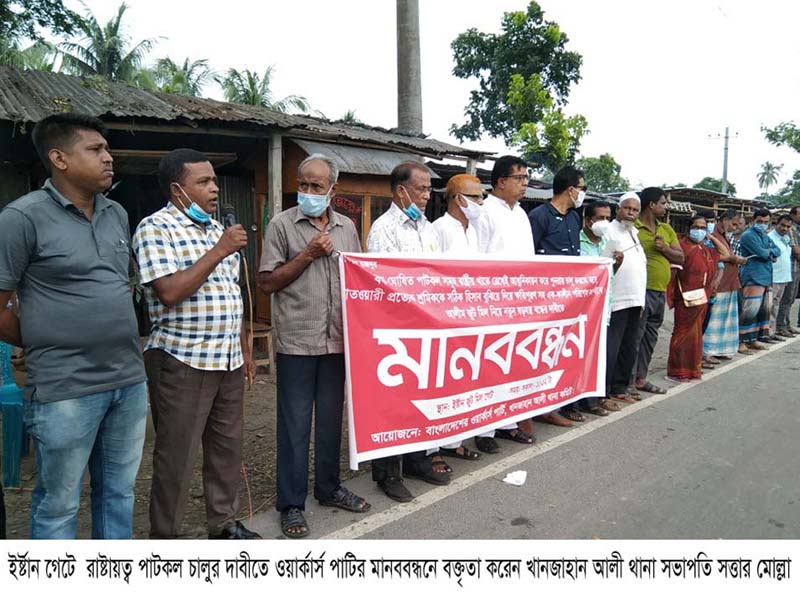 ফুলবাড়ীগেট(খুলনা) সংবাদদাতা ॥বন্ধ ঘোষিত রাষ্ট্রায়ত্ব পাটকল রাষ্ট্রীয় খাতে রেখে পুনরায় চালু ও আধুনিকায়ন করা এবং শ্রমিকদের বকেয়া পাওনা পরিশোধের দাবিতে গতকাল সোমবার সকাল ১১ টা থেকে বেলা ১২ টা পর্যন্ত ১ ঘন্টা খানজাহান আলী থানা ওয়ার্কার্সপার্টির উদ্যোগে ইষ্টার্ণগেটে মানববন্ধন কর্মসূচি পালন করে। এ সময় বক্তব্য দেন ওয়ার্কার্স পার্টির কেন্দ্রীয় সদস্য দিপঙ্কর সাহা দিপু, ওয়াকার্সপাটির থানা সভাপতি আ. সত্তার মোল্লা, সরদার আমিরুল ইসলাম, কমরেড মফিদুল ইসলাম, কমরেড মিজানুর রহমান, মারুফুল ইসলাম প্রমুখ।
