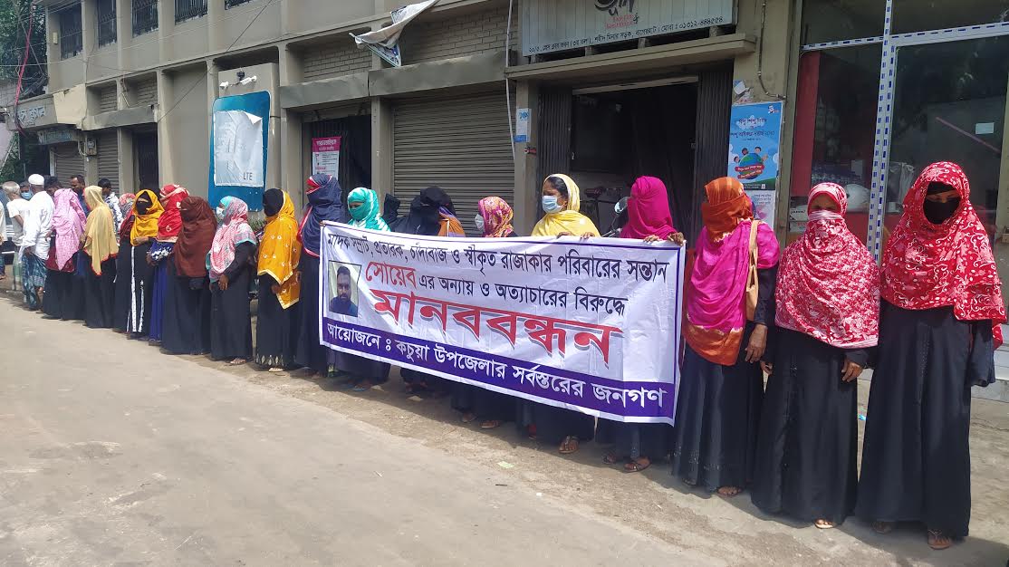 বাগেরহাটের কচুয়া উপজেলার প্রতারক সোয়াইব ইসলাম সোয়েবের অপকর্মের বিরুদ্ধে বুধবার চন্দ্রপাড়া নারী-পুরুষ সোয়েবের দৃষ্টান্তমূলক শাস্তির দাবিতে মানববন্ধন করেন-লোকসমাজ