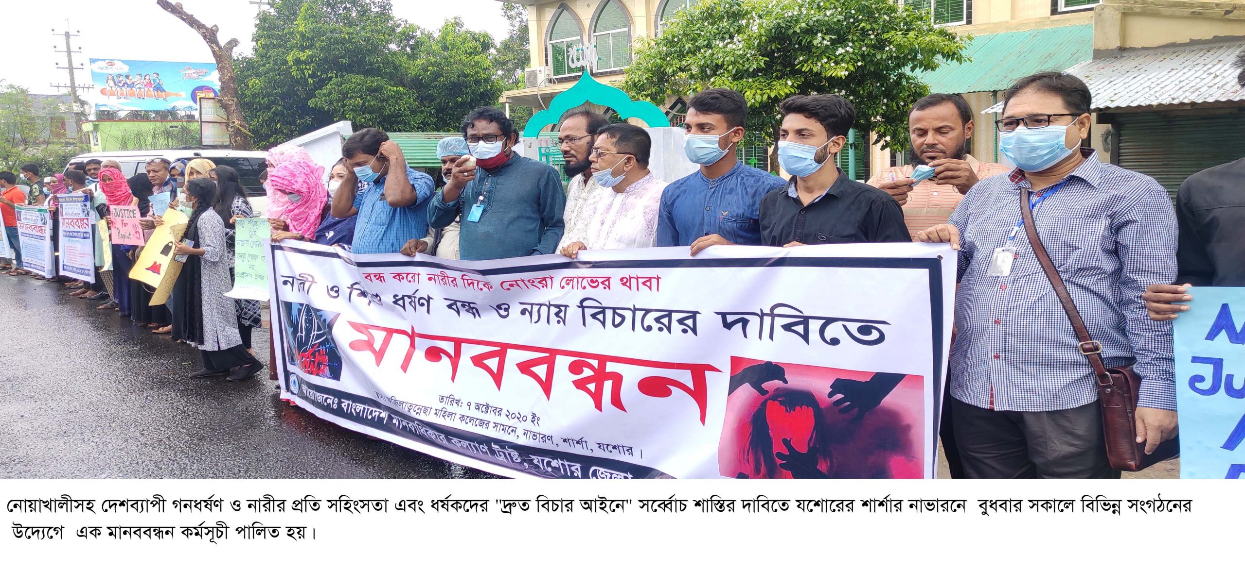 ধর্ষকদের দ্রুত বিচার আইনে সর্ব্বোচ শাস্তির দাবিতে শার্শা উপজেলার নাভারণে মানববন্ধন পালিত-লোকসমাজ