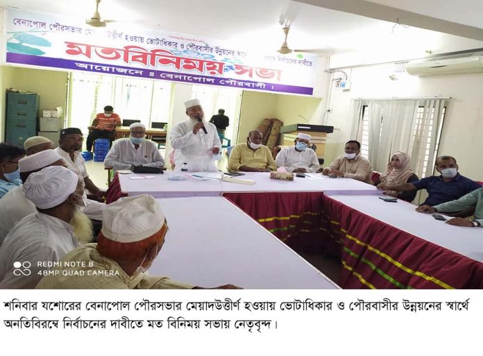 শার্শা (যশোর) সংবাদদাতা ॥ যশোরের বেনাপোল পৌরসভার মেয়াদ উত্তীর্ণ হওয়ায় ভোটাধিকার ও পৌরবাসীর উন্নয়নের স্বার্থে অনতিবিলম্বে নির্বাচনের দাবিতে মতবিনিময় সভা অনুষ্ঠিত হয়েছে। ‘পৌরবাসী’ এর ব্যানারে ২১টি সংগঠন বেনাপোল পৌরসভার নির্বাচনের দাবিতে শনিবার সকাল ১১টায় সিএন্ডএফ এজেন্টস এসোসিয়েশন মিলনায়তনে এ সভার আয়োজন করে।
