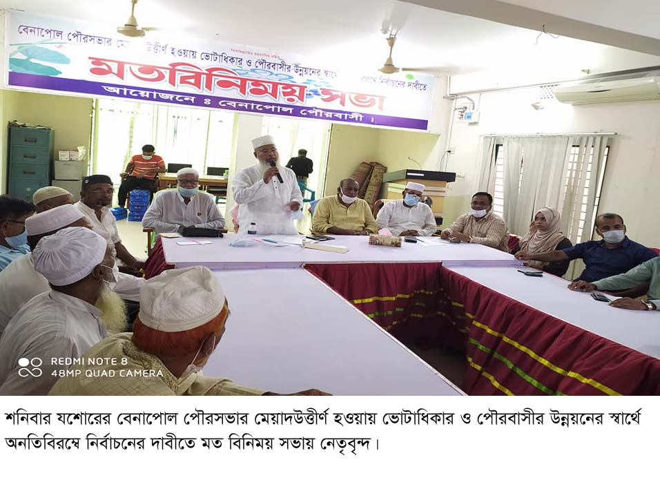 মুস্তাফিজুর রহমান স্বপনের সভাপতিত্বে সভায় বক্তব্য রাখেন মুক্তিযোদ্ধা শাহ আলম, বেনাপোল সিএন্ডএফ এসোসিয়েশনের সিনিয়র সহসভাপতি আলহাজ নুরুজ্জামান, সিএন্ডএফ ব্যবসায়ী আলহাজ এনামুল হক মুকুল, আলহাজ নাছির উদ্দিন, সাংবাদিক মহসিন মিলন, আব্দুর রহিম, মনিরুল ইসলাম মনি ও কামাল হোসেন, যশোর জেলা পরিষদের সদস্য অহেদুজ্জামান অহিদ, বেনাপোল বাজার কমিটির সভাপতি আজিজুর রহমান, বেনাপোল ইউনিয়ন পরিষদের চেয়ারম্যান বজলুর রহমান, জুলফিকার আলী মন্টু, সিএন্ডএফ এজেন্ট স্টাফ এসোসিয়েশনের সভাপতি মজিবুর রহমান, বন্দর হ্যন্ডলিং ইউনিয়নের সভাপতি রাজু মিয়া, ট্রাক শ্রমিক ইউনিয়নের সভাপতি মো. শাহীন, প্রাইভেটকার সমিতির সভাপতি মতিয়ার রহমান, আকবর হোসেন প্রমুখ। সভায় আগামী সপ্তাহে নির্বাচনের দাবিতে মানববন্ধন, সমাবেশ ও সংবাদ সম্মেলন করার ঘোষনা দেয়া হয়। উল্লেখ্য, সীমানা নির্ধারণ নিয়ে মামলা থাকায় দীর্ঘ ১০ বছর ধরে বেনাপোল পৌরসভার নির্বাচন হচ্ছে না।