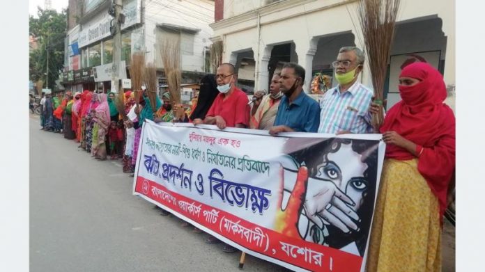 স্টাফ রিপোর্টার॥ নারী ও শিশু ধর্ষণ এবং নির্যাতনের প্রতিবাদে যশোরে ঝাঁটা প্রদর্শন ও বিক্ষোভ করেছে বাংলাদেশের ওয়ার্কার্স পার্টি (মার্কসবাদী)। সোমবার (১১ অক্টোবর) বিকালে যশোর শহরের ভোলা ট্যাংক রোডে দলীয় কার্যালয়ের সামনে এই বিক্ষোভ অনুষ্ঠিত হয়। এতে অংশ নেওয়া নেতৃবৃন্দ বলেন, ধারাবাহিক ধর্ষণের ঘটনার সঙ্গে ক্ষমতাবান ব্যক্তি বা গোষ্ঠী সম্পৃক্ত। তাদের হাত থেকে বৃদ্ধা, শিশু কেউই রেহাই পাচ্ছেন না। ক্ষমতাসীনদের কোনও পদধারী যখন ধর্ষণের ঘটনায় অভিযুক্ত হচ্ছেন, তখন তাকে অনুপ্রবেশকারী বলে চালিয়ে দেওয়া হচ্ছে।