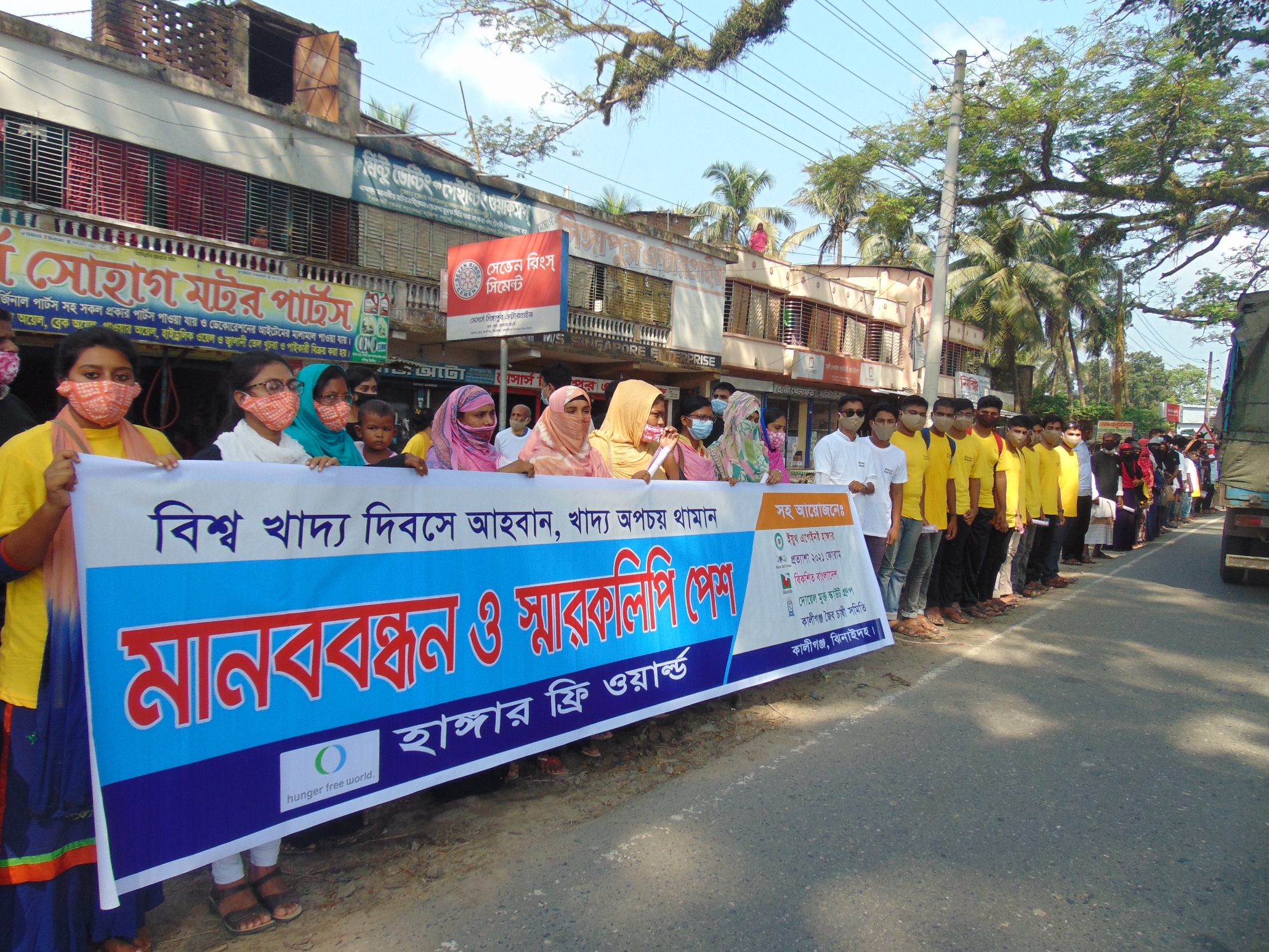 কালীগঞ্জ (ঝিনাইদহ) সংবাদদাতা ॥ কালীগঞ্জে বিশ্ব খাদ্য দিবস উপলক্ষে খাদ্য অপচয় রোধে র‌্যালি, মানবববন্ধন ও স্মারকলিপি পেশ করা হয়েছে। কালীগঞ্জের ৫টি সংগঠনের উদ্যোগে এই কর্মসূচি পালন করা হয়। আয়োজক হিসেবে ছিলেন জাপানভিত্তিক স্বেচ্ছাসেবী সংস্থা ‘হাঙ্গার ফ্রি ওয়ার্ল্ড’। বৃহস্পতিবার সকাল ১০ টায় বলিদাপাড়াস্থ হাঙ্গার ফ্রি ওয়ার্ল্ড অফিস চত্বর থেকে একটি র‌্যালি বের হয়। পরে ঢাকা-খুলনা মহাসড়কের কালীগঞ্জের বৈশাখী তেলপাম্প এলাকায় ঘন্টাব্যাপী মানববন্ধন কর্মসূচি পালন করে সংগঠনের সদস্যরা। মানববন্ধন শেষে বিশ্ব খাদ্য দিবসে খাদ্য অপচয় থামান, করোনায় ক্ষতিগ্রস্ত কৃষিখাতের সুরক্ষা এবং খাদ্য ও পুষ্টি নিরাপত্তা নিশ্চিতে কালীগঞ্জ উপজেলা নির্বাহী অফিসার সুবর্ণা রানী সাহার কাছে ১০ দফা দাবিতে স্মারকলিপি পেশ করা হয়।