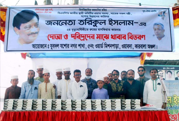 বিএনপির জাতীয় স্থায়ী কমিটির প্রয়াত সদস্য সাবেক মন্ত্রী তরিকুল ইসলামের দ্বিতীয় মৃত্যুবার্ষিকী উপলক্ষে যশোর শহরের দুঃস্থদের মাঝে ৫ নম্বর ওয়ার্ড যুবদল নগর শাখার আয়োজনে খাবার বিতরণ করা হয়-লোকসমাজ