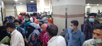 লোকসমাজ ডেস্ক ॥ বঙ্গবন্ধু শেখ মুজিব মেডিকেল বিশ্ববিদ্যালয়ের (বিএসএমএমইউ) বহির্বিভাগ ভবনের পঞ্চম তলায় চর্ম ও যৌন রোগ বিশেষজ্ঞের করে বাইরে রোগীদের দীর্ঘলাইন। সবাই নির্দিষ্ট দূরত্ব তো মানেইনি, বরং গায়ের সঙ্গে গা ঘেঁষে দাঁড়িয়ে অপো করছেন। হাসপাতালের স্টাফ ও তাদের আত্মীয়-স্বজনের পরিচয়ে সিরিয়াল ভেঙে করে ভেতরে প্রবেশ করা নিয়ে কিছুণ পর পর হৈ চৈ করছেন রোগীরা। শুধু পঞ্চম তলাতেই নয়, আন্ডারগ্রাউন্ডে ডায়াগনস্টিক ল্যাবরেটরি ও নিচতলার টিকিট কাউন্টার থেকে শুরু করে পঞ্চম তলা পর্যন্ত বিভিন্ন ফোরের বিভিন্ন বিভাগের চিকিৎসকের করে সামনে রোগীদের উপচেপড়া ভিড় এবং গায়ের সাথে গা ঘেঁষে দাঁড়িয়ে থাকতে দেখা যায়। আজিমপুরের বাসিন্দা গৃহবধূ আসমা আক্তার মেয়ের চর্ম রোগের চিকিৎসার জন্য বিএসএমএমইউতে এসেছেন। তিনি বলেন, ‘হাসপাতালে রোগীরা গায়ে গা ঘেঁষে দাঁড়াচ্ছেন। সবাই যেভাবে মাস্ক খুলে কথাবার্তা বলছেন, তাতে হাসপাতালে রোগের চিকিৎসা নিতে এসে আবার করোনা না ধরে!’