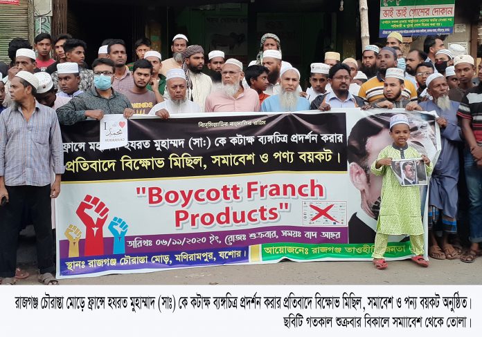 রাজগঞ্জ (যশোর) সংবাদদাতা ॥ ফ্রান্সে মহানবী হযরত মুহম্মদ স. এর ব্যঙ্গচিত্র প্রদর্শনের প্রতিবাদে শুক্রবার বিকেলে মণিরামপুর উপজেলার রাজগঞ্জে তাওহিদী জনতা চৌরাস্তা মোড়ে বিক্ষোভ সমাবেশ করেছে। ওই সমাবেশে হাজী আব্দুস সাত্তারের সভাপতিত্বে বক্তব্য রাখেন, মুফতি মামুনুর রশিদ, আবু হুরাইয়া, ডা. শরিফুল ইসলাম, হাফেজ আবু শাহিনুর রহমান। বক্তব্য শেষে রাজগঞ্জ বাজারের প্রধান প্রধান সড়কে বিক্ষোভ মিছিল করে তািেহদী জনতা।