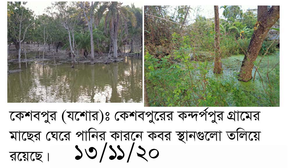 কেশবপুরের কন্দর্পপুর গ্রামের মাছের ঘেরে পানির কারণে কবরস্থানগুলো তলিয়ে রয়েছে-লোকসমাজ
