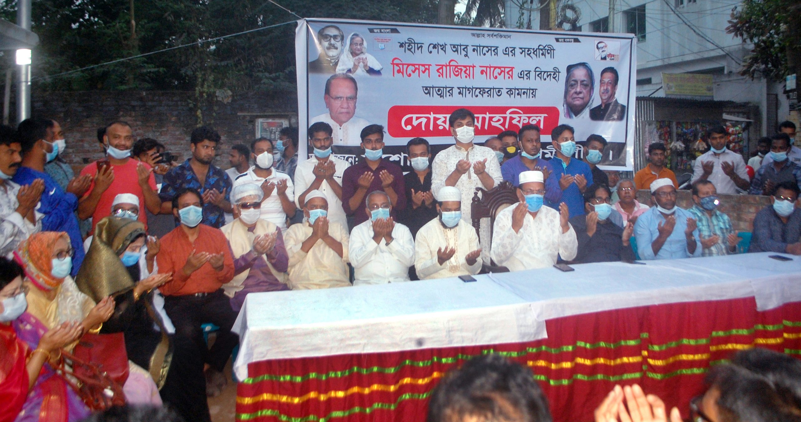 স্টাফ রিপোর্টার ॥ শহীদ শেখ আবু নাসেরের সহধর্মিনী রাজিয়া নাসেরের বিদেহী আত্মার মাগফিরাত কামনায় যশোরে দোয়া মাহফিল অনুষ্ঠিত হয়েছে। গতকাল বাদআছর যশোর জেলা আওয়ামী লীগ এই দোয়া মাহফিলের আয়োজন করে। মাহফিলপূর্ব আলোচনা সভায় সভাপতিত্ব করেন জেলা আওয়ামী লীগের সভাপতি শহিদুল ইসলাম মিলন। বক্তব্য রাখেন- সহ-সভাপতি হায়দার গনি খান পলাশ, যুগ্ম সাধারণ সম্পাদক অ্যাড. মনিরুল ইসলাম, মীর জহুরুল ইসলাম, সাংগঠনিক সম্পাদক মোস্তফা ফরিদ আহমেদ চৌধুরী, ফারুক আহমেদ কচি, সুখেন মজুমদার, নওয়াপাড়া ইউনিয়ন পরিষদের চেয়ারম্যান নাসরিন সুলতানা খুশি, অ্যাড. সেতারা খাতুন, লাইজু জামান, আওয়ামী লীগ নেতা ওহিদুল ইসলাম তরফদার, ফিরোজ খান, কামাল হোসেন, লুৎফুল কবির বিজু, জেলা যুবলীগ নেতা সৈয়দ মুনির হোসেন টগর প্রমুখ।