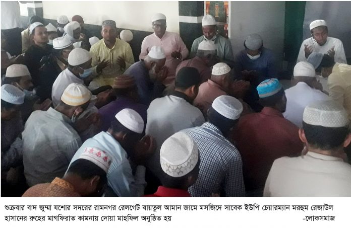 শুক্রবার বাদ জুম্মা যশোর সদরের রামনগর রেলগেট বায়তুল আমান জামে মসজিদে সাবেক ইউপি চেয়ারম্যান রেজাউল হাসানের রুহের মাগফিরাত কামনায় দোয়া মাহফিল অনুষ্ঠিত হয়-লোকসমাজ