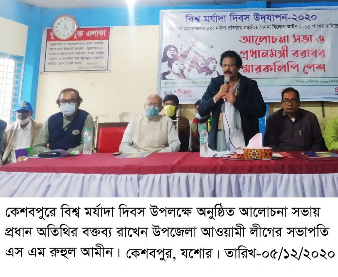 স্টাফ রিপোর্টার, কেশবপুর (যশোর) ॥ কেশবপুরে দলিত পরিষদ আয়োজিত বিশ্ব মর্যাদা দিবস উপলে শনিবার সকালে শহরের প্রাথমিক শিক সমিতির মিলনায়তনে এক আলোচনা সভা অনুষ্ঠিত হয়েছে। দিবসটিতে দলিতদের মানবাধিকার এবং মর্যাদা প্রতিষ্ঠায় প্রস্তাবিত বৈষম্য বিলোপ আইন ২০১৫ পাশের দাবি করা হয়। দলিত পরিষদের সভাপতি সুজন দাসের সভাপতিত্বে সভায় প্রধান অতিথির বক্তব্য দেন, উপজেলা আওয়ামী লীগের সভাপতি এস.এম. রুহুল আমীন। বিশেষ অতিথির বক্তব্য দেন, উপজেলা আওয়ামী লীগের সহ-সভাপতি তপন কুমার ঘোষ মন্টু, উপজেলা নাগরিক সমাজের আহ্বায়ক অ্যাডভোকেট আবু বক্কর সিদ্দিকী, কেশবপুর প্রেস কাবের সভাপতি আশরাফ-উজ-জামান খান, সাধারণ সম্পাদক জয়দেব চক্রবর্ত্তী ও খেলাঘর আসরের আহ্বায়ক আব্দুল মজিদ, প্রভাষক কানাই লাল ভট্টাচার্য্য।