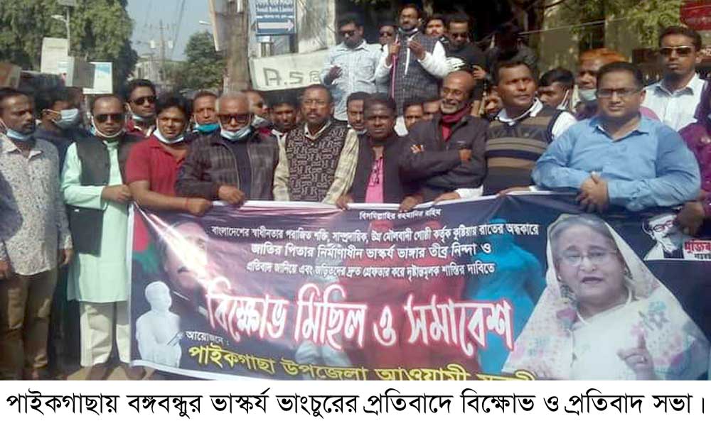 পাইকগাছা (খুলনা) সংবাদদাতা ॥ বঙ্গবন্ধুর ভাস্কর্য ভাঙচুরের প্রতিবাদে খুলনার পাইকগাছা উপজেলা আওয়ামীলীগ ও সহযোগী সংগঠনের উদ্যোগে বিক্ষোভ মিছিল ও সমাবেশ হয়েছে। সোমবার সকাল ১০ টায় পাইকগাছা পৌর সদরে বিক্ষোভ মিছিল বর করা হয়। মিছিল শেষে বাজার চৌরাস্তা মোড়ে প্রতিবাদ সমাবেশে সভাপতিত্ব করেন যুবলীগ নেতা শেখ শহীদ হোসেন বাবলু। প্রধান অতিথি ছিলেন উপজেলা আ.লীগ সভাপতি ও উপজেলা চেয়ারম্যান আনোয়ার ইকবাল মন্টু। পৌর ছাত্রলীগের সভাপতি রায়হান পারভেজ রনির পরিচালনায় সভায় বিশেষ অতিথি ছিলেন, মো. রশীদুজ্জামান, শিয়াবুদ্দিন ফিরোজ বুলু, প্রভাষক ময়নুল ইসলাম এবং এমএম আজিজুল হাকিম। অন্যান্যের মধ্যে বক্তব্য রাখেন, বিভূতি ভূষণ সানা, বাবু কৃষ্ণপদ মন্ডল, আব্দুস সালাম কেরু, এস এম শাহাবুদ্দিন শাহিন, জসিম উদ্দিন বাবু, এস এম শামসুর রহমান, গাজী আব্দুর রাজ্জাক রাজু, শেখ জিয়াদুল ইসলাম জিয়া, জগদীশ চন্দ্র রায়, আবু সাঈদ কালাই, আ. ওয়াব বাবলু প্রমুখ।
