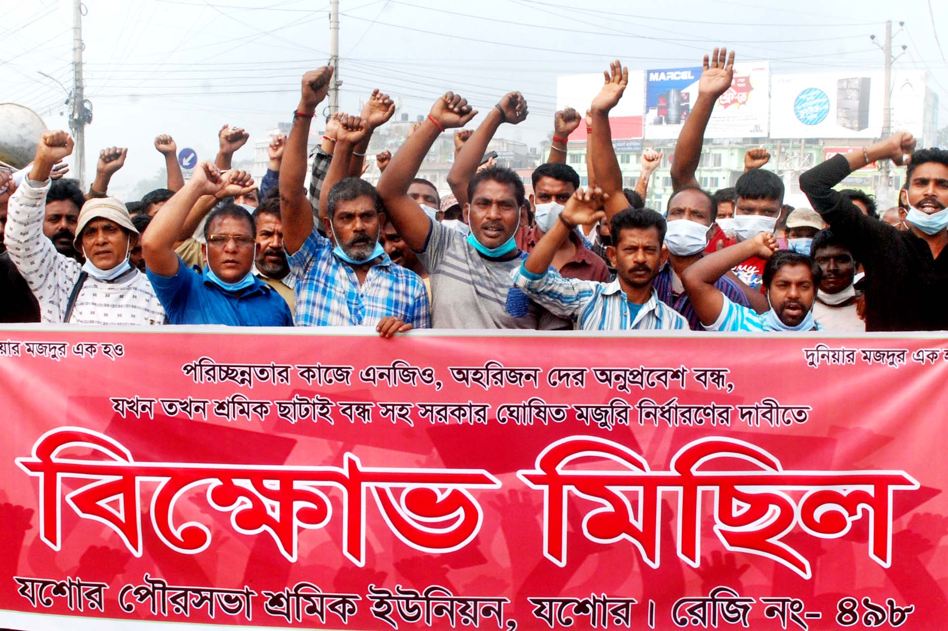 যশোর পৌরসভার পরিচ্ছন্ন কাজে এনজিওদের নিয়োগের মাধ্যমে হরিজনদের অনুপ্রবেশ বন্ধ ও সরকার ঘোষিত গেজেট অনুযায়ী মজুরি নির্ধারণ এবং যখন-তখন শ্রমিক ছাটাইয়ের প্রতিবাদে হরিজনরা শহরে বিক্ষোভ মিছিল বের করে-লোকসমাজ