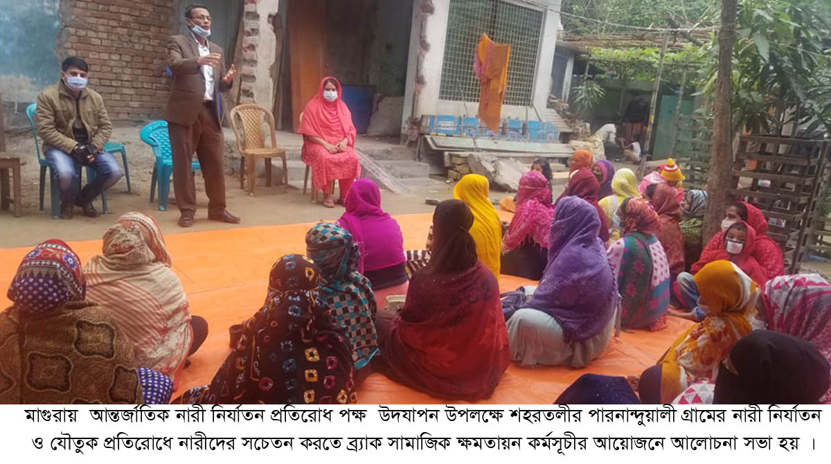 মাগুরা সংবাদদাতা ॥ নারী নির্যাতন, বাল্যবিবাহ ও যৌতুক সর্ম্পকে গ্রামের সাধারণ নারীদের সচেতন করতে শহরতলীর পারনান্দুয়ালী গ্রামে সভা হয়েছে । ব্র্যাক সামাজিক ক্ষমতায়ন কর্মসূচি বৃস্পতিবার দুপুরে এ সভার আয়োজন করে। সভায় নারীদের সচেতন করতে নারী নির্যাতন ও যৌতুক সর্ম্পকে নানা দিক নিদের্শনামুলক বক্তব্য রাখেন জেলা মহিলা বিষয়ক অধিদপ্তরের উপ-পরিচালক মো: আব্দুল আওয়াল। অনুষ্ঠানে সংগঠনটির সামাজিক ক্ষমতায়ন কর্মসূচির পল্লী সমাজের সদস্যরা অংশ নেয় ।