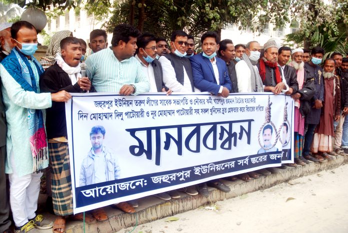 যশোরের বাঘারপাড়া জোহরপুর ইউনিয়নের তরুণ লীগের সাবেক সভাপতি খালেদুর রহমান টিটোর হত্যাকারীদের গ্রেফতার করে বিচারের দাবিতে গতকাল প্রেস কাব যশোরের সামনে বাঘারপাড়া জোহরপুর এলাকাবাসী মানববন্ধন কর্মসূচি পালন করেন-লোকসমাজ