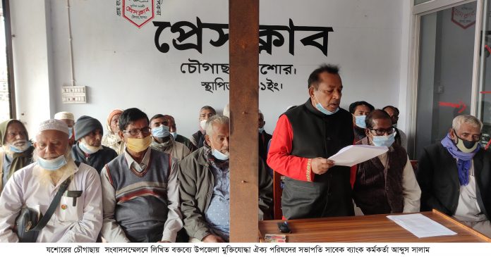 যশোরের চৌগাছায় সংবাদ সম্মেলনে লিখিত বক্তব্যে উপজেলা মুক্তিযোদ্ধা ঐক্য পরিষদের সভাপতি সাবেক ব্যাংক কর্মকর্তা আব্দুস সালাম-লোকসমাজ