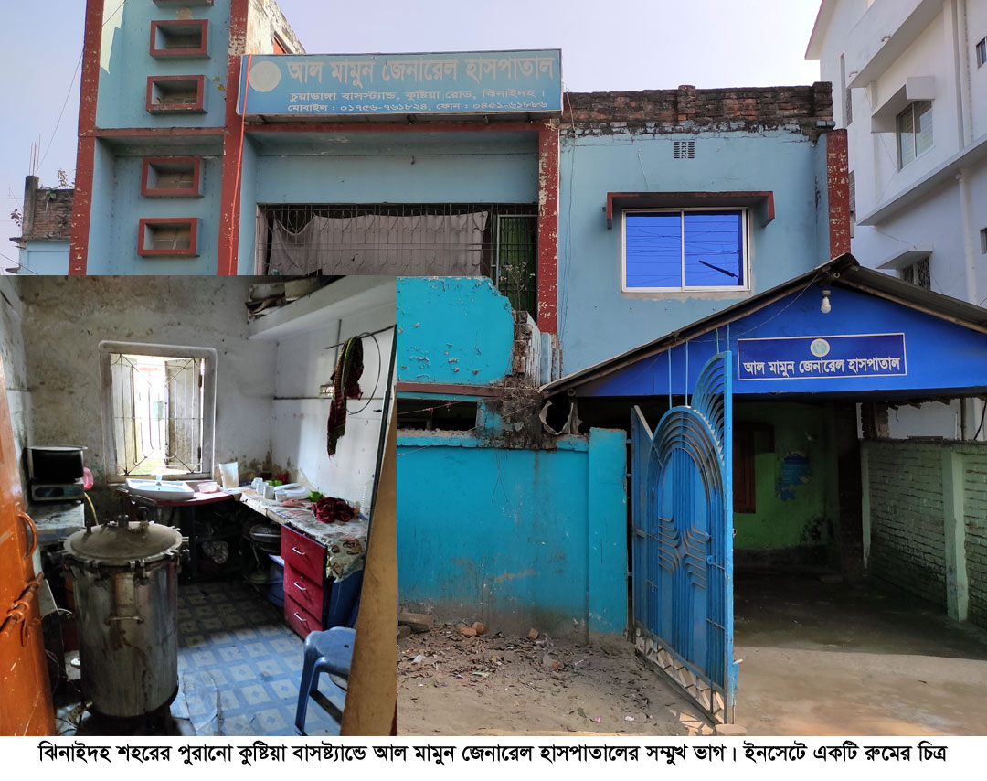 ঝিনাইদহ শহরের পুরানো কুষ্টিয়া বাসস্ট্যান্ডে আল মামুন জেনারেল হাসপাতালের সম্মুখ ভাগ। ইনসেটে একটি রুমের চিত্র-লোকসমসাজ
