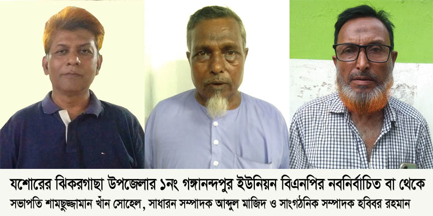 ঝিকরগাছা (যশোর) সংবাদদাতা॥ ভোটের মাধ্যমে যশোরের ঝিকরগাছা উপজেলার গঙ্গানন্দপুর ইউনিয়ন বিএনপির নেতা নির্বাচন অনুষ্ঠিত হয়েছে। নবগঠিত কমিটিতে শামছুদ্দিন খাঁন সোহেল সভাপতি, আব্দুল মাজিদ সাধারণ সম্পাদক ও হবিবর রহমান সাংগঠনিক সম্পাদক নির্বাচিত হয়েছেন।