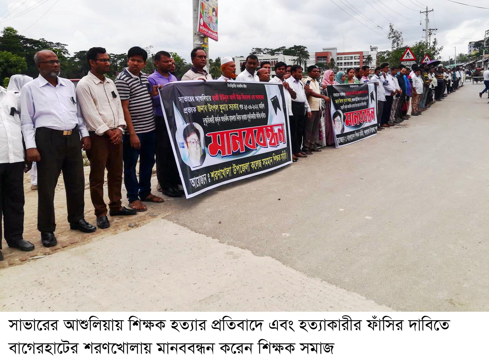 শরণখোলা (বাগেরহাট) সংবাদদাতা ॥ সাভারের আশুলিয়ার হাজী ইউনুস আলী উচ্চ বিদ্যালয় অ্যান্ড কলেজের শিক্ষক উৎপল কুমার সরকার হত্যার প্রতিবাদে মানববন্ধন করেছে শরণখোলা মাধ্যমিক ও কলেজ শিক্ষক সমিতি। বৃহস্পতিবার বেলা ১১ টায় শরণখোলা প্রেস ক্লাবের সামনের সড়কে এ প্রতিবাদ কর্মসূচি পালন করেন শিক্ষকবৃন্দ।