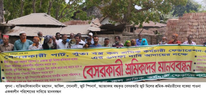 খুলনায় বেসরকারি জুট মিল শ্রমিকদের বকেয়া পরিশোধের দাবিতে মানববন্ধন
