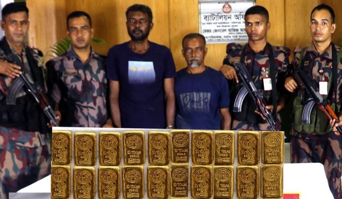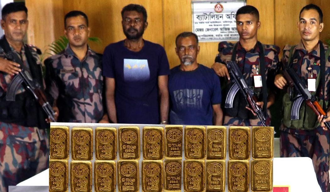 স্টাফ রিপোর্টার, ঝিনাইদহ ॥ ঝিনাইদহের মহেশপুর সীমান্তে ২০টি সোনার বারসহ দুই পাচারকারীকে আটক করেছে বিজিবি। বৃহস্পতিবার (৪ মে)  রাত ১০টার দিকে উপজেলার কাজীরবেড় গ্রাম থেকে ওই সোনা উদ্ধার হয়। এ সময় পাচারকারী পলিয়ানপুর গ্রামের সাদির আলী মন্ডলের ছেলে আছানুর রহমান ও একই গ্রামের চয়ন মন্ডলের ছেলে নবিছদ্দিন মন্ডলকে আটক করা হয়। উদ্ধার করা ২০টি সোনার বারের ওজন ২ কেজি ৩৩১.১২ গ্রাম।