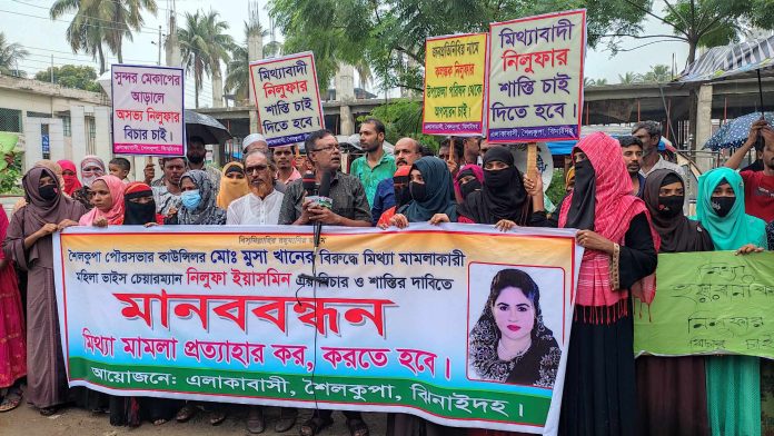 তার প্রতিবাদে রোববার দুপুরে ৫নম্বও ওয়ার্ডের পৌর কাউন্সিলর মুসা খান মহিলা ভাইস চেয়ারম্যান নিলুফা ইয়াসমিনের ‘মিথ্যা ভিত্তিহীন বানোয়াট’ সংবাদ সম্মেলনকে চ্যালেঞ্জ করে শৈলকুপা শহরে বিক্ষোভ মিছিল,মানববন্ধন ও সংবাদ সম্মেলন করেন। নারী-পুরুষ রাজনৈতিক কর্মী- সমর্থকেরা নিলুফা ইয়াসমিনের বিরুদ্ধে ব্যানার, ফেস্টুন, প্লাকার্ডসহ শ্লোগানে শৈলকুপা শহরের বিভিন্ন সড়ক প্রদক্ষিণ শেষে উপজেলা শহীদ মিনার পাদদেশে মানববন্ধন করেন। এ সময় উপজেলা আওয়ামী লীগের সহসভাপতি নাসিরুল ইসলাম খাঁন, সাবেক কাউন্সিলর খাইরুল ইসলাম মুকুল, বর্তমান কাউন্সিলর মুসা খাঁন বক্তব্য রাখেন।স্বেচ্ছাসেবকলীগের সাবেক নেতা বাবু খাঁনের সঞ্চালনায় মানববন্ধনে নিলুফা ইয়াসমিনকে অসভ্য আখ্যায়িত করে ‘মিথ্যা’ অভিযোগ প্রত্যাহার, দলীয় শৃঙ্খলা বজায় রাখার আহ্বান জানানো হয়।