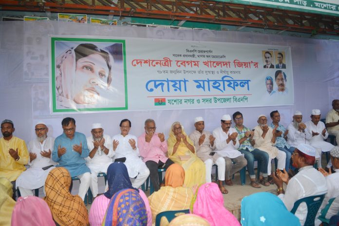 স্টাফ রিপোর্টার ॥ গুরুতর অসুস্থ বিএনপি চেয়ারপার্সন সাবেক প্রধানমন্ত্রী বেগম খালেদা জিয়ার সুস্থতা কামনায় যশোরে দোয়া মাহফিল অনুষ্ঠিত হয়েছে। দলীয় প্রধানের ৭৮ তম জন্মদিন উপলক্ষে  বুধবার নগর ও সদর উপজেলা বিএনপির যৌথ আয়োজনে বাদ আছর দলীয় কার্যালয়ে দোয়া মাহফিল অনুষ্ঠিত হয়। দোয়া মাহফিলের পূর্বে সংক্ষিপ্ত বক্তৃতায় বিএনপির খুলনা বিভাগীয় ভারপ্রাপ্ত সাংগঠনিক সম্পাদক অনিন্দ্য ইসলাম অমিত বলেন, গণতন্ত্রকামী মানুষকে নেতৃত্ব শূূন্য করতে ফ্যাসিস্ট সরকার প্রহসনের বিচারে বেগম খালেদা জিয়াকে অন্যায়ভাবে সাজা প্রদান করে। কারণ বেগম খালেদা জিয়া যদি বাইরে থাকেন তাহলে গণতন্ত্রকামী মানুষের আন্দোলন চূড়ান্ত রূপ লাভ করে ফ্যাসিস্ট সরকারের মসনদ ভেঙে চুরমার হয়ে যাবে। যাতে করে তিনি গণতন্ত্রকামী মানুষের নেতৃত্ব দিতে না পারেন,তারা যেন নেতৃত্ব শূন্য হয়ে যায়। কিন্তু প্রকৃতি শূন্যতা পছন্দ করে না। যে কারণে বেগম খালেদা জিয়া কারান্তরীণ হওয়ার পর দেশ নায়ক তারেক রহমান গণতন্ত্রকামী মানুষের নেতৃত্বে দিচ্ছেন।