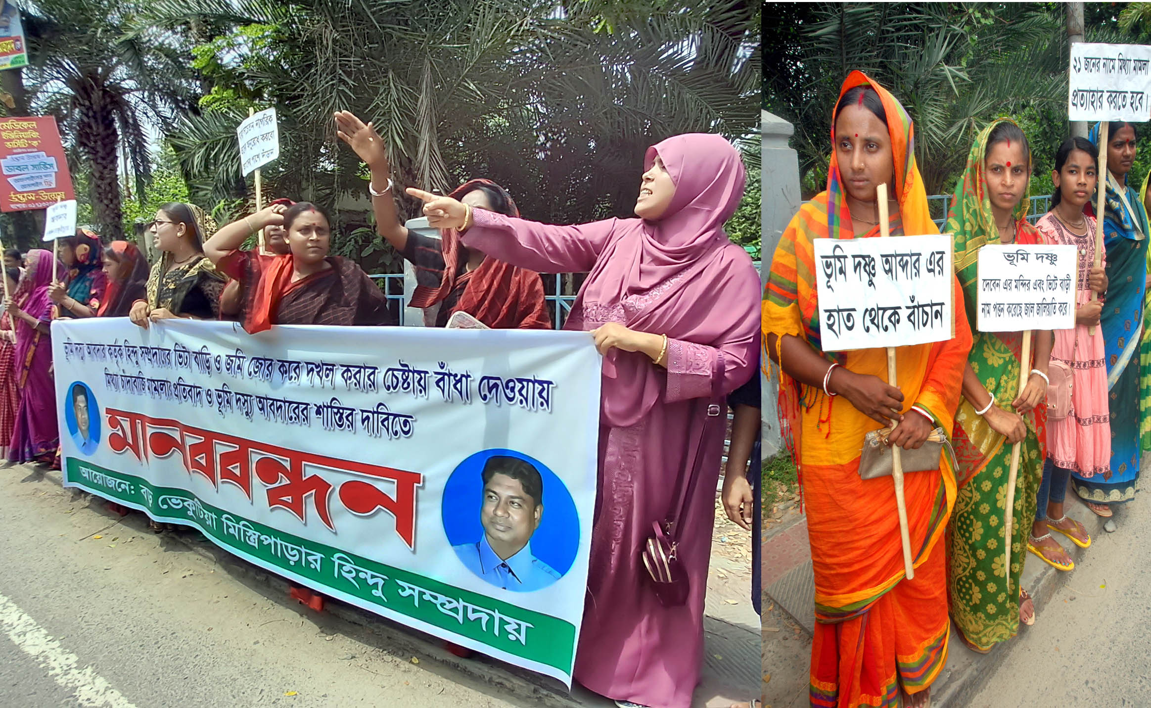 মানববন্ধনে হিন্দু পরিবারের সদস্যরা বলেন, আরবপুরের ভেকুটিয়া মিস্ত্রিপাড়া এলাকায় ৩০-৩৫টি পরিবারের জমি দখল নেওয়ার চেষ্টা করছে আব্দার নামের এক ব্যক্তি। তিনি জমির কাগজপত্র জাল করে নিজের নামে লিখে নিচ্ছেন। পরবর্তীতে প্রভাব বিস্তার করে সেই জমি দখলে নেওয়ার পাঁয়তারা চালিয়ে যাচ্ছেন। স্থানীয় জনপ্রতিনিধিরা তাকে সাহায্য করছে বলেও দাবি করা হয়। জোর করে জমি দখল ও বাউন্ডারি ভাঙার চেষ্টার সময় হিন্দু পরিবারের ছেলে মেয়েরা বাধা দিলে তাদের ২১ জনের নামে ২২ লাখ টাকা চাঁদাবাজির মিথ্যা মামলা করা হয়েছে। যেকারণে এই সংখ্যালঘু সম্প্রদায়ের পরিবারের সদস্যরা হয়রানির শিকার হচ্ছে এবং নিজেদের জমি হারাতে বসেছে। মিথ্যা চাঁদাবাজির মামলায় আটকের ভয়ে পরিবারের অধিকাংশ সদস্যরা ঘর ছাড়া।