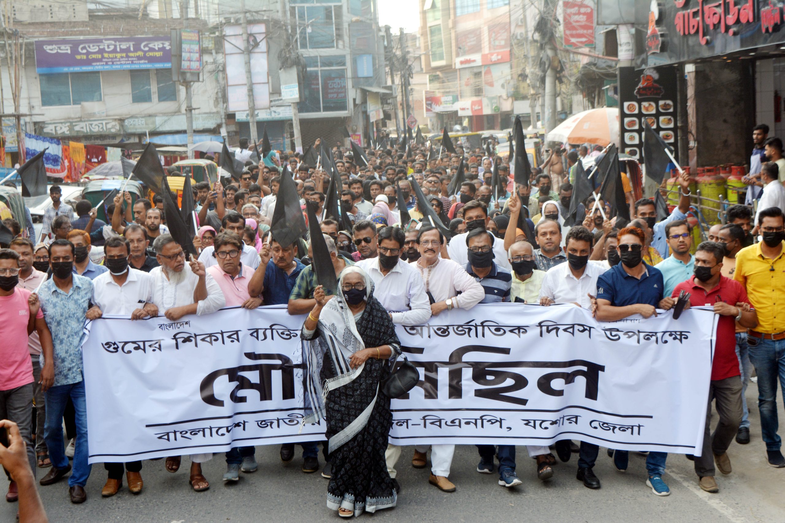 এমন পরিস্থিতির মধ্য দিয়ে যশোর জেলা বিএনপির আহ্বায়ক অধ্যাপক নার্গিস বেগম নেতাকর্মীদের সাথে নিয়ে দলীয় কার্যালয়ে প্রবেশ করেন। সেখান থেকে তাঁর নেতৃত্বে মৌন মিছিল বের হয়। মিছিলটি জেলা বিএনপি কার্যালয়ের ডান পাশের সড়ক থেকে বের হয়ে বঙ্গবাজার, এমকে রোডসহ শহরের গুরুত্বপূর্ণ সড়ক প্রদিক্ষণ শেষে দলীয় কার্যালয়ে এসে শেষ হয়। দলীয় নেতাকর্মীরা মুখে কালো কাপড় বেঁধে ও হাতে কালো পতাকা নিয়ে মিছিলে অংশ নেন।