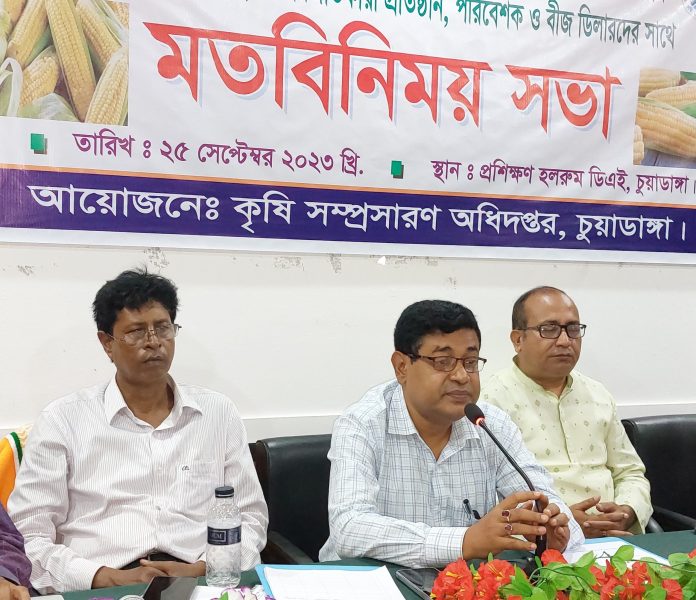 চুয়াডাঙ্গা কৃষি সম্প্রসারণ অধিদপ্তরের উপ-পরিচালক বিভাস চন্দ্র সাহার সভাপতিত্বে অধিদপ্তরের প্রশিক্ষণ কক্ষে অনুষ্ঠিত এ মতবিনিময় সভায় ভুট্টা বীজ আমদানিকারক, বাজারজাতকারী প্রতিষ্ঠান, পরিবেশক ও বীজ ডিলারদের সঙ্গে মতবিনিময় সভায় উপস্থিত ছিলেন বীজ প্রত্যয়ণ কর্মকর্তা সাইফুল ইসলাম, অতিরিক্ত উপ-পরিচালক (উদ্যান) মোমরেজ আলী, সদর উপজেলা কৃষি কর্মকর্তা আফরিন বিনতে আজিজ, আলমডাঙ্গা উপজেলা কৃষি কর্মকর্তা রেহানা পারভীন ও জীবননগর উপজেলা কৃষি কর্মকর্তা মোহাম্মদ মনিরুজ্জামান।