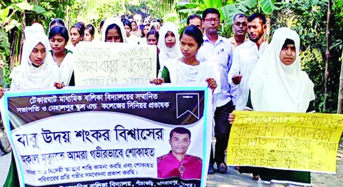 স্টাফ রিপোর্টার,মনিরামপুর(যশোর)॥ যশোরের মনিরামপুরে গুলি করে নেহালপুর ইউনিয়ন যুবলীগের সভাপতি প্রভাষক উদয় শংকর বিশ^াসকে হত্যার ঘটনায় আওয়ামী লীগের সাবেক নেতা পবিত্র বিশ্বাসসহ চারজনের নাম উল্লেখসহ অজ্ঞাত কয়েকজনের বিরুদ্ধে মামলা করা হয়েছে। নিহতের মা ছবি রানী বিশ্বাস বাদি হয়ে সোমবার রাতে মনিরামপুর থানায় মামলাটি দায়ের করেন। ওই রাতেই পুলিশ অভিযান চালিয়ে মামলার আসামি পরিতোষ বিশ্বাস ও উত্তম বিশ্বাসকে আটক করে। মঙ্গলবার দুপুরে পুলিশ রিমান্ডের আবেদন জানিয়ে তাদেরকে আদালতে চালান দিয়েছে। এদিকে দোষীদের শাস্তির দাবিতে টেকারঘাট মাধ্যমিক বিদ্যালয়ের শিক্ষক-শিক্ষার্থীরা বিক্ষোভ মিছিল ও মানববন্ধন কর্মসূচি পালন করেছেন।