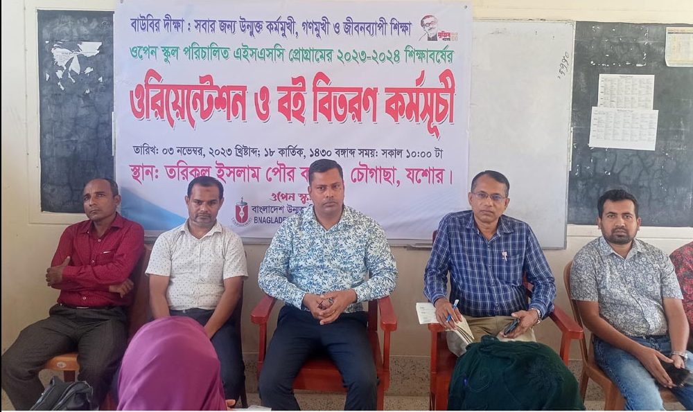 স্টাফ রিপোর্টার, চৌগাছা (যশোর) ॥ যশোরের চৌগাছায় বাংলাদেশ উন্মুক্ত বিশ্ববিদ্যালয়ের অধীনে এইচএসসি প্রোগ্রামের ২০২৩ ব্যাচের ওরিয়েন্টেশন ও বই উৎসব অনুষ্ঠিত হয়েছে। শুক্রবার সকালে চৌগাছা তরিকুল ইসলাম পৌর কলেজের সভাকক্ষে এই ওরিয়েন্টেশন অনুষ্ঠিত হয়। ওরিয়েন্টেশন ও বই উৎসবে বাংলাদেশ উন্মুক্ত বিশ্ববিদ্যালয়ের আঞ্চলিক পরিচালক (যশোর) বিষ্ণুপদ ভৌমিক প্রধান অতিথি হিসেবে উপস্থিত ছিলেন।