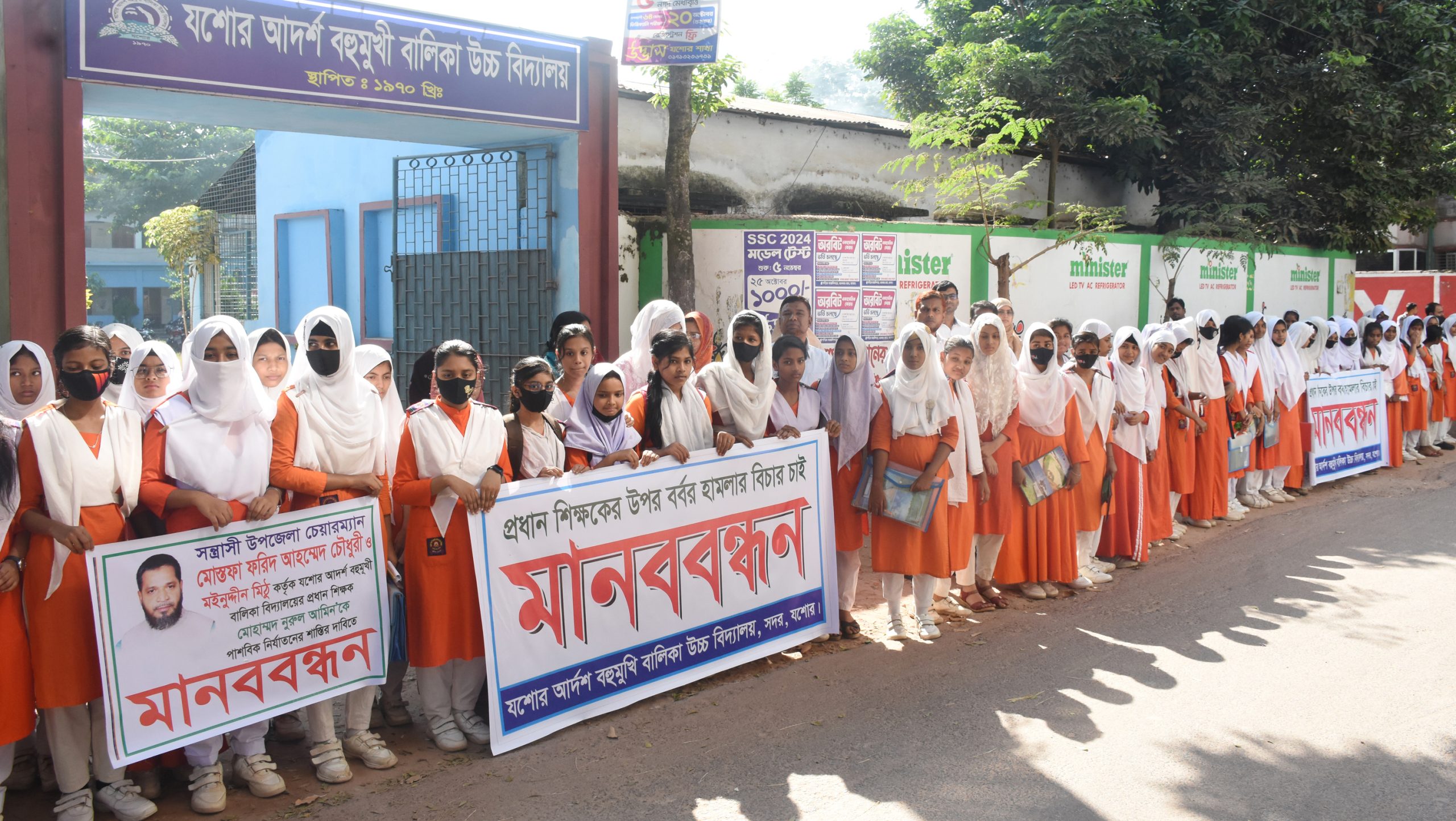 প্রধান শিক্ষককে নির্যাতনের প্রতিবাদে যশোর আদর্শ বালিকা বিদ্যালয়ের শিক্ষার্থীদের মানববন্ধন