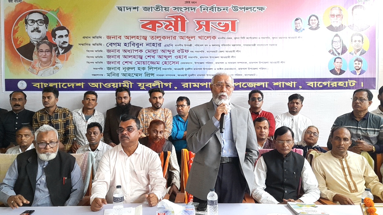 এমএ সবুর রানা, রামপাল (বাগেরহাট)॥ আসন্ন দ্বাদশ জাতীয় সংসদ নির্বাচন নৌকা প্রতীকের পক্ষে ভোট চাইলেন খুলনা সিটি কর্পোরেশনের মেয়র তালুকদার আবদুল খালেক। বাগেরহাট -৩ (রামপাল -মোংলা) আসনের জন্যে ভোট চেয়ে তিনি বলেন, অবহেলিত রামপালে স্কুল, কলেজ, রাস্তাঘাট, কলকারখানাসহ বিভিন্ন স্থাপনা আওয়ামী লীগ সরকার করেছে। এই অঞ্চলের মানুষের ভাগ্য উন্নয়নে শেখ হাসিনা বিশেষ গুরুত্ব দিয়ে রামপাল তাপবিদ্যুৎ কেন্দ্র নির্মাণ সম্পন্ন ও খান জাহান আলী বিমানবন্দর নির্মানের কাজ করছেন। শেখ হাসিনা আছে বলেই মানুষ শান্তিতে বসবাস করছে। যে কারণে আগামী দ্বাদশ জাতীয় নির্বাচনে দেশে একটি গ্রহণযোগ্য নির্বাচনের মাধ্যমে পুনরায় শেখ হাসিনাকে ক্ষমতায় আনতে হবে।