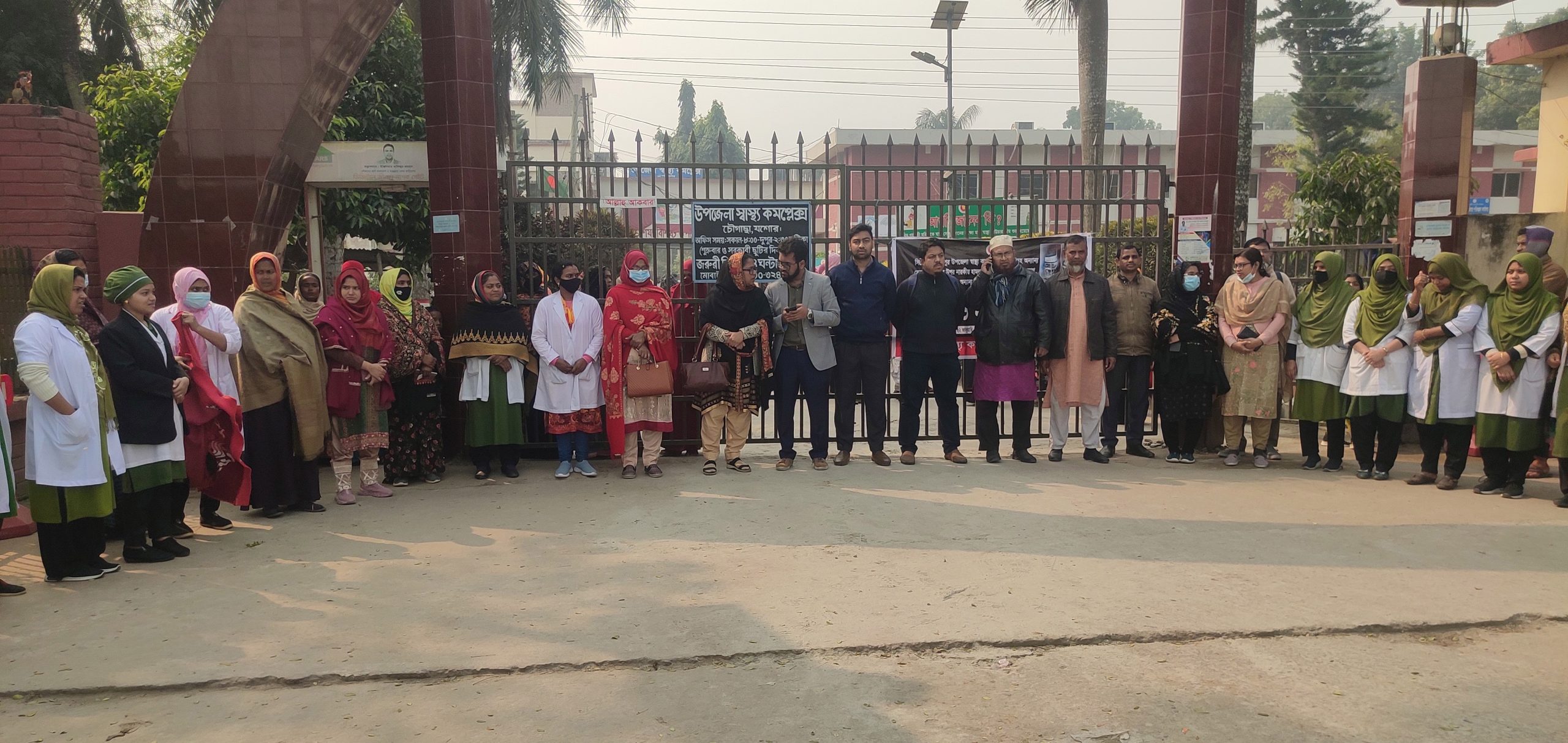 এর প্রতিবাদে মঙ্গলবার সকালে হাসপাতালের পক্ষ থেকে মানববন্ধন ও কর্মবিরতি পালন করা হয়েছে। প্রায় ঘন্টাব্যাপী এই মানববন্ধন অনুষ্ঠিত হয়। এ সময় জরুরি চিকিৎসাসেবা ছাড়া হাসপাতালের সকল কার্যক্রম বন্ধ ছিল। কর্মবিরতির ফলে বেশকিছু রোগী ভোগান্তির শিকার হন বলে আগত রোগীরা জানান।