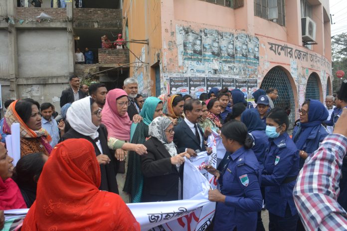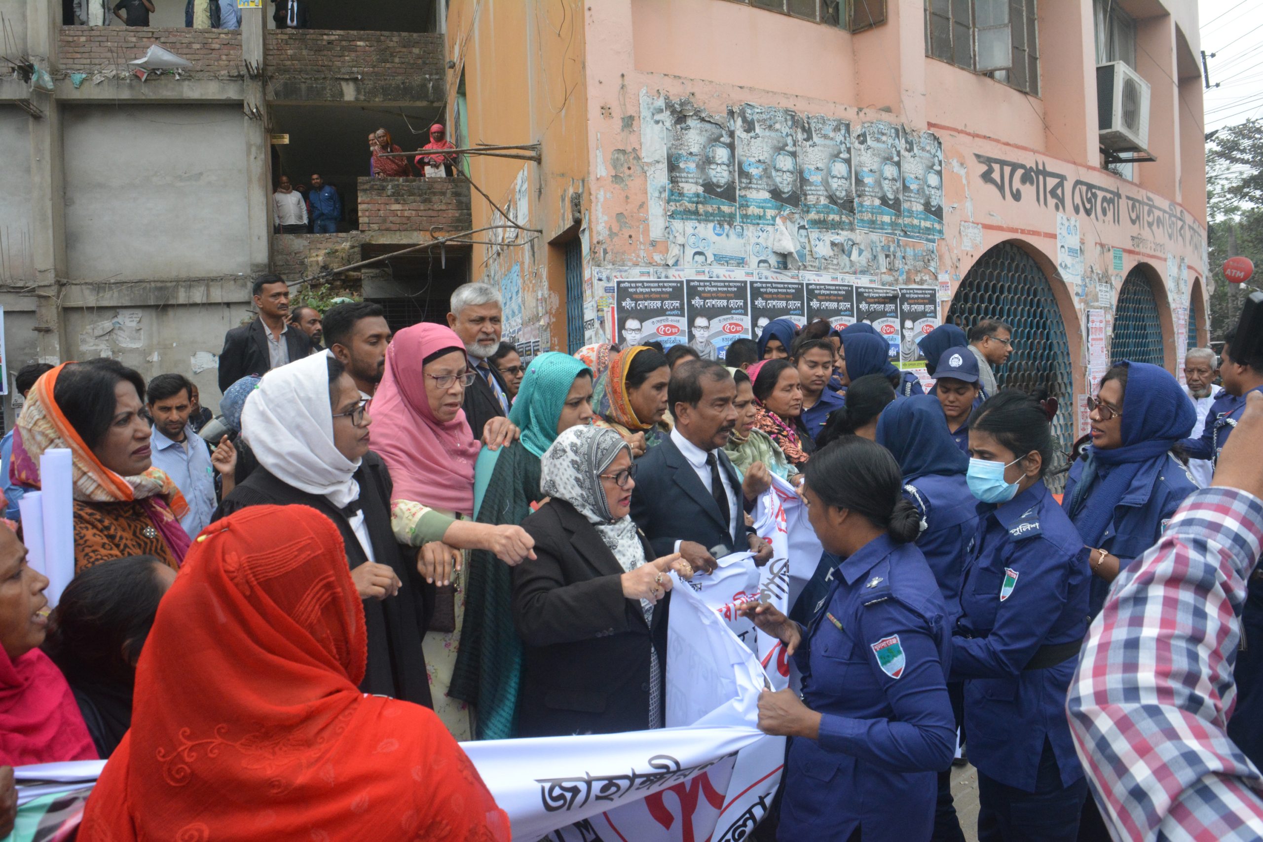 যশোরে মহিলাদলের মানববন্ধন পুলিশের মারমুখী আচরণে পণ্ড
