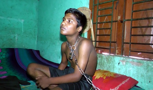 স্টাফ রিপোর্টার, ঝিনাইদহ॥ অন্ধকার ঘরের চৌকির ওপর বসে ১৫ বছরের কিশোর রিয়াজ। গলায় শেকল পড়িয়ে ঝোলানো আছে বড় তালা। শেকলের অন্যপ্রাপ্ত চৌকির সাথে বাঁধা। গত ৩ বছর ধরে এভাবেই শেকলবন্দি রয়েছে কিশোর রিয়াজ। অবশ্য মাঝে মাঝে পিতা ও মায়ের সাথে বাইরে যেতে পারলেও ছাড়া পায় না সে। ঝিনাইদহ শহরের আরাপপুর এলাকার একটি ভাড়া বাসায় মা নার্গিস খাতুন ও পিতা লিটন হোসেনের সাথে বসবাস করছে রিয়াজ।